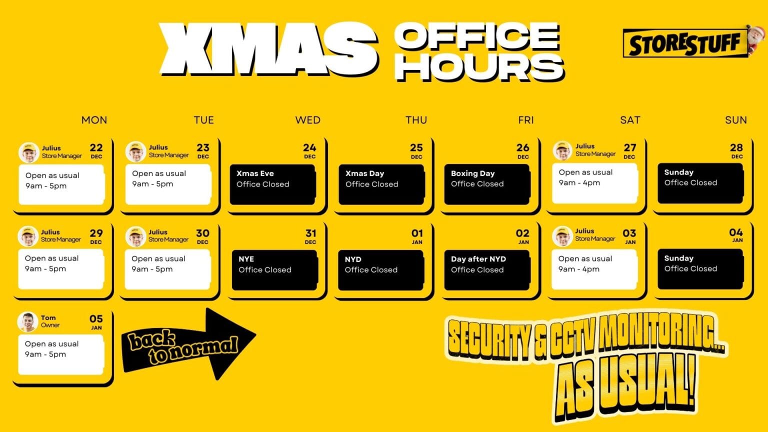 Special Holiday Closures: Xmas Eve, Xmas Day, Boxing Day, NYE, NYD, Day after NYD.
